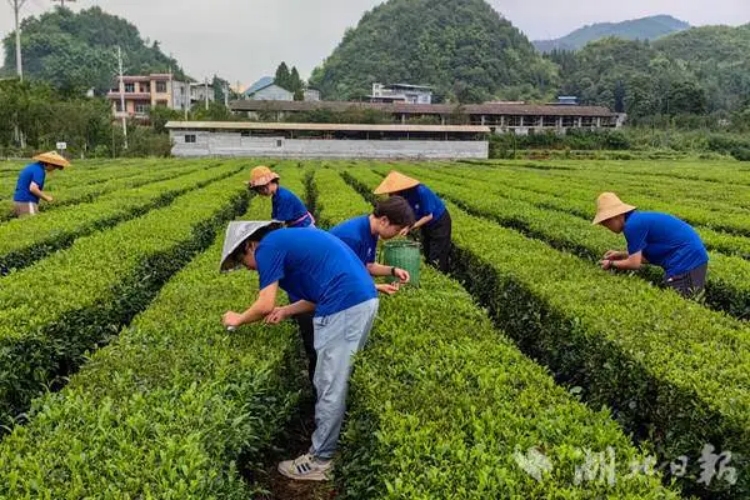 “茶香高山云雾质,水甜幽泉霜当魂”。来凤县是中国藤茶第一县,实践团队走访了当地制茶企业,深入茶园体验采茶。