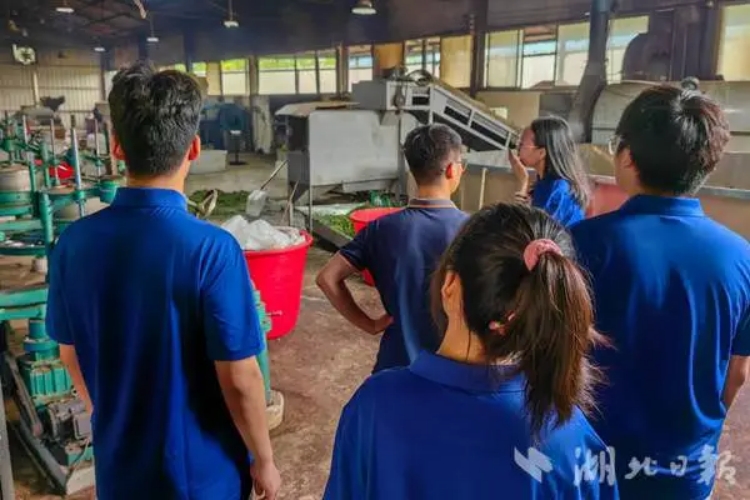 工作人员带领团队成员参观了制茶车间。据介绍,茶企在数字化乡村建设和推动当地经济发展方面发挥着重要作用,但也面临着发展瓶颈,当地茶叶生产车间设备较为落后,茶叶的线上销售渠道较少,大部分都是自产自销。因此,实践团队也通过直播的形式帮助推广当地藤茶品牌。