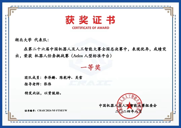 8月25日,第二十六届中国机器人及人工智能大赛全国决赛圆满结束。由威廉希尔教师张伟指导、电子信息专业研究生组成的团队,在Aelos人型标准平台比赛项目斩获一等奖,即该赛事最高奖项。