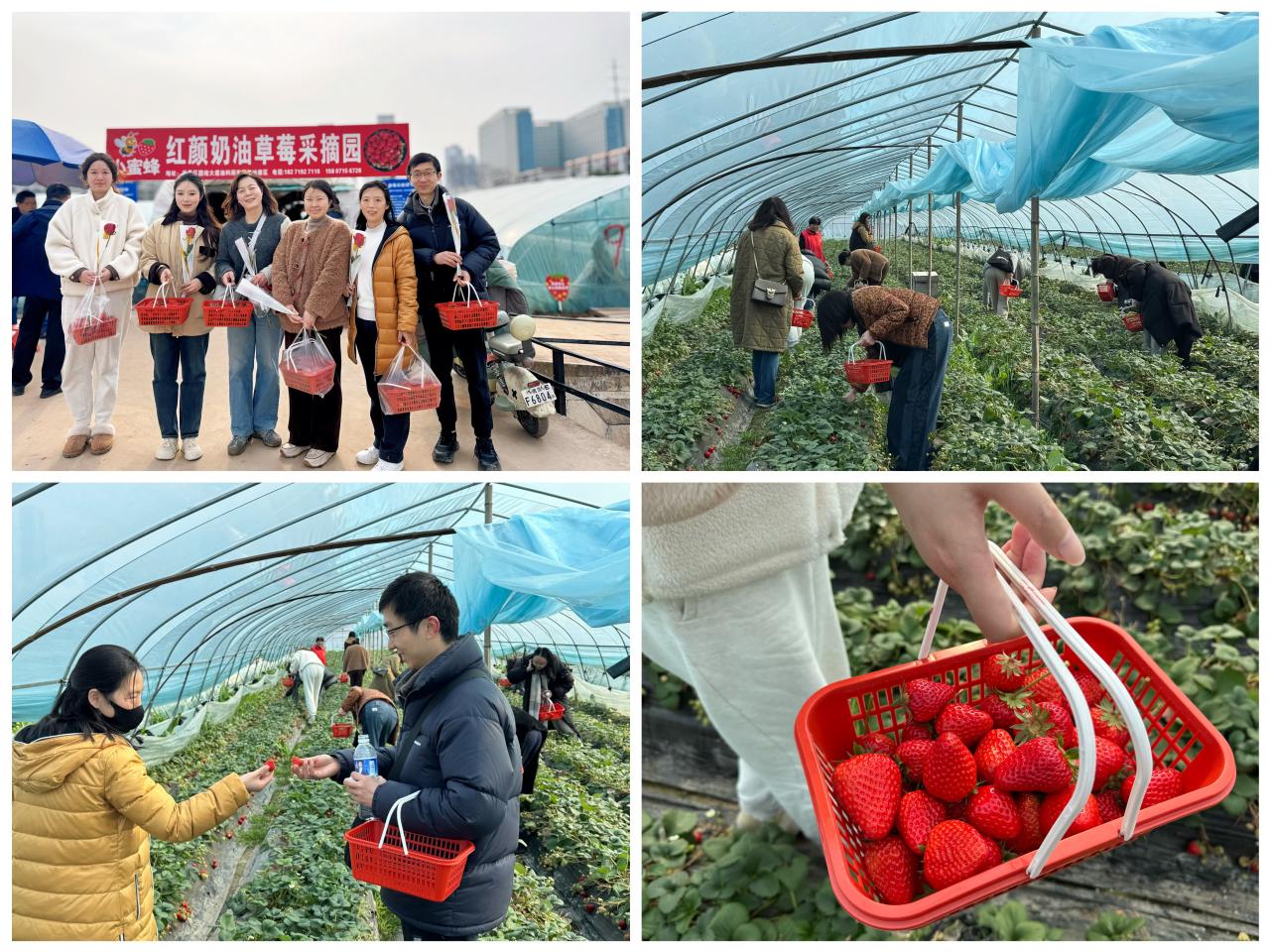 老师们手持果篮穿梭于温室大棚,挑选饱满鲜红的红颜奶油草莓,果香弥漫的种植园里,大家一边分享采摘技巧,一边用镜头记录春日田园的生机盎然。