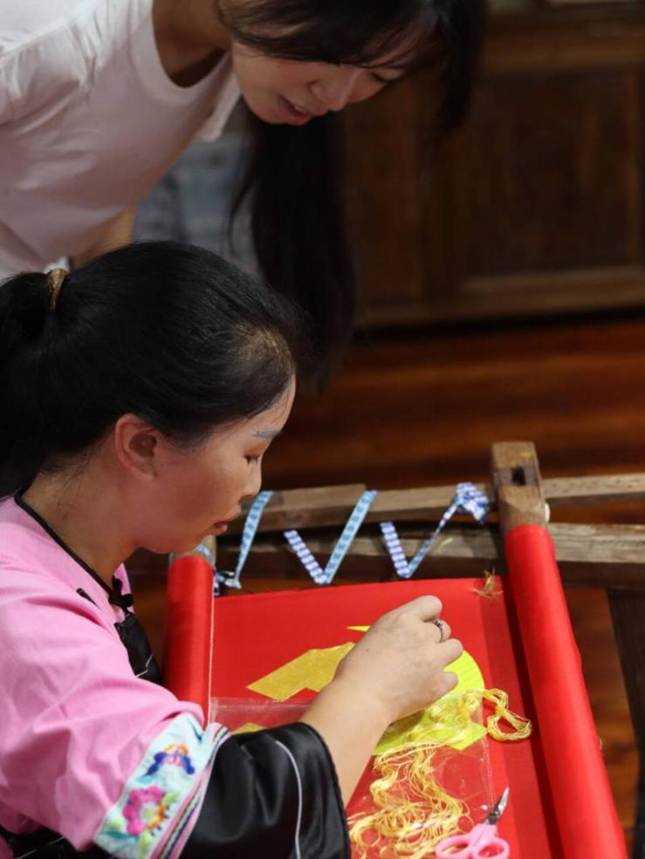 在十八洞村的苗绣工坊里,苗族妇女以一针一线延续着民族的生活智慧与艺术精神。苗绣有绉绣、打籽绣和辫绣三种传统绣法,绉绣是通过细密褶皱营造立体感的技法,打籽绣是用密集结点绣出繁星般图案的针法,辫绣则是以丝线盘绕形成清晰纹理的编织工艺,它们共同体现了苗族绣娘对自然、节序与生活秩序的细腻感知与审美智慧。其中,绉绣是苗绣中极具立体感的技法之一,常与打籽绣等针法相结合,生动再现苗族先民对自然万物的细致观察。