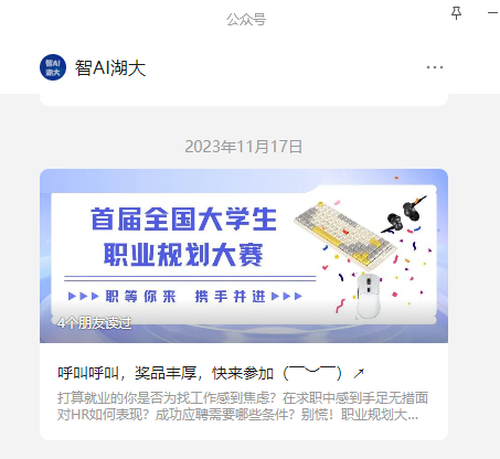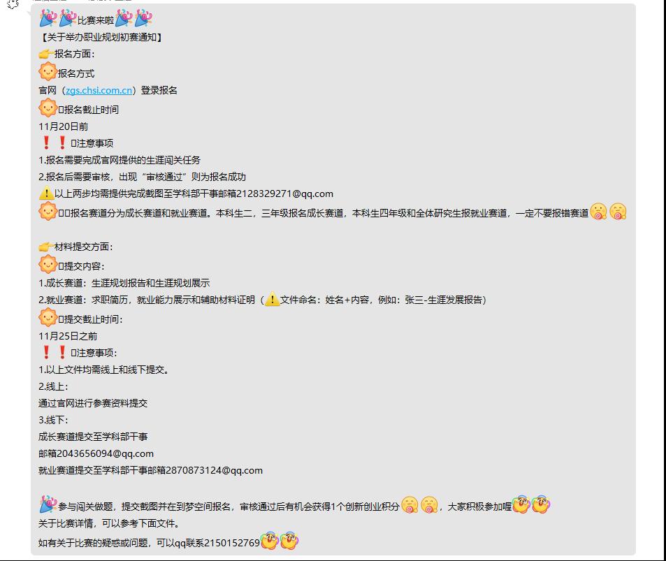 公司通过微信公众号、班级QQ群、微信群广泛宣传“全国老员工首届职业规划大赛”相关情况,从参赛优势、对个人成长帮助、对今后就业发展益处等方面开展介绍,同时增设奖品,动员员工积极参赛报名。下附活动宣传图片。