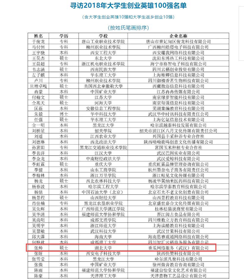 张帅,现为香瓜网络服务(武汉)有限公司创始人、执行董事兼总经理。他读大专两年,参军两年,读本科两年,于2017年考入威廉希尔官方网站研究生公司计算机技术专业。他在大二期间便做起了网站主、开淘宝店等创业尝试,于2015年创办了太原市香蕉网络科技有限公司,主要从事微信开发和网站开发,为各大企事业单位提供互联网服务。后于2018年注册成立香瓜网络服务(武汉)有限公司,增加业务,人工智能研发,AI研发,物联网研究工作,并且取得一定成效。